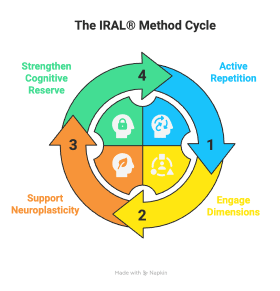 The IRAL® Method uses structured, active repetition to support working memory and gently encourage the reactivation of natural speech reflexes we rely on every day, yet often lose after trauma or cognitive decline.
